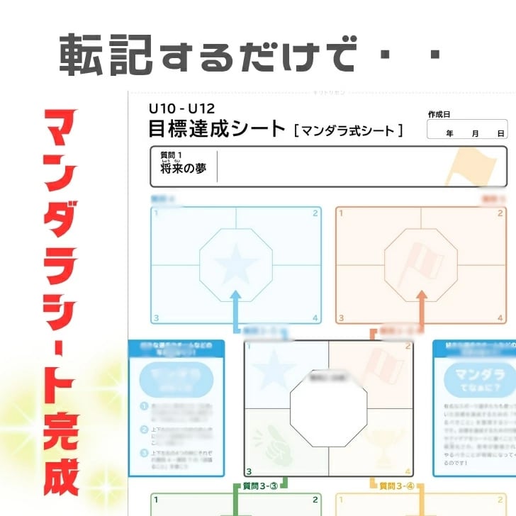 本来のマンダラチャートは9×9のマス目に、設定した目標に対する行動やアイデアを書いていくことで思考力を高め、頭の中を整理して行動を具現化していくフレームワークです。しかし、高学年とはいえ小学生には9×9のマス目を埋めていくのはとても難し作業です。そこで、このノートでは小学4年生からでも取り組みやすいように4マスバージョンのマンダラチャートを開発しました。
