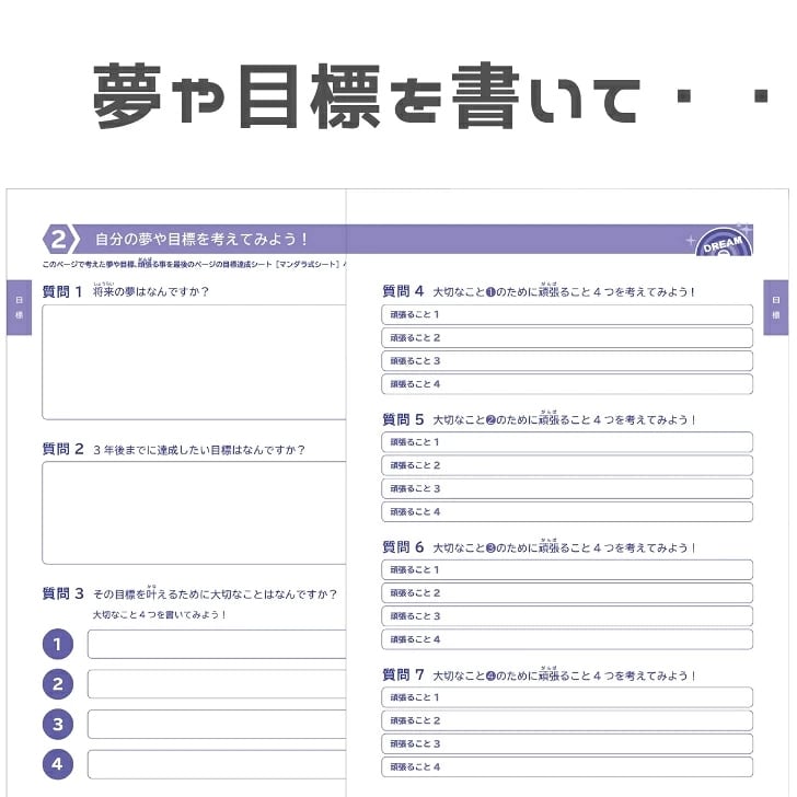 まず、下のページを記入していくことで夢や目標を明確にし、目標のためにどんな行動をするのか、何を頑張るのかを考えて言語化していきます。