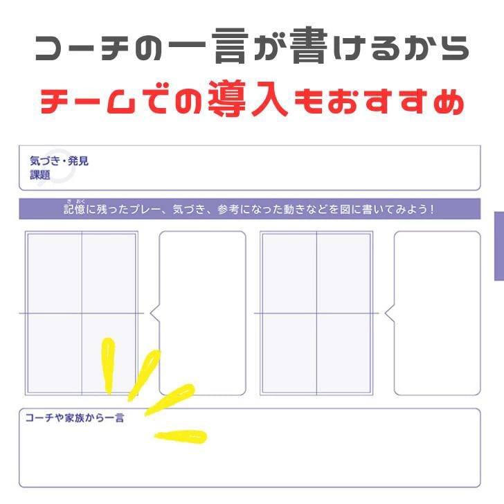 1日の練習後に課題や振り返りを毎回1ページ分書いていくのは難しいですよね。練習後は夜遅くなったり、書く内容も1ページ分を考えたり、1ページ分も無かったりすると、書く気力をなくし書くことが辛くなって続けていくことができなくなります。