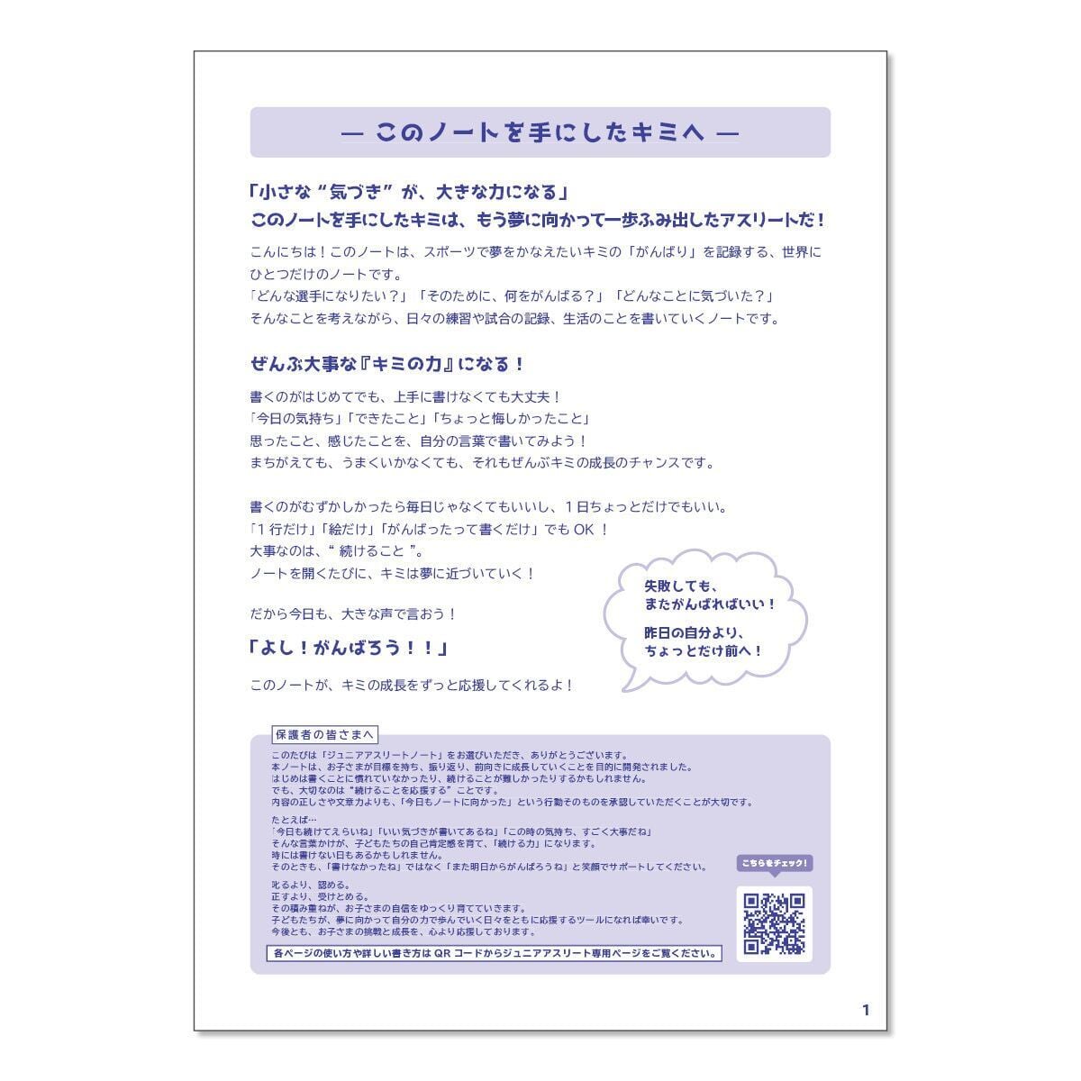 このノートは、10歳~12歳(小学4年生~6年生)くらいまでの子を対象に、まずは習慣づけることを目的に内容は難しくないように工夫してあります。将来の夢や小学校卒業までの目標、日々の生活習慣から練習や試合の結果と課題などを記録することで、子どもの「考える力・言語化する力・習慣化する力・気づきの力」の育成をこのノートを書くことからスタートしてみてください。