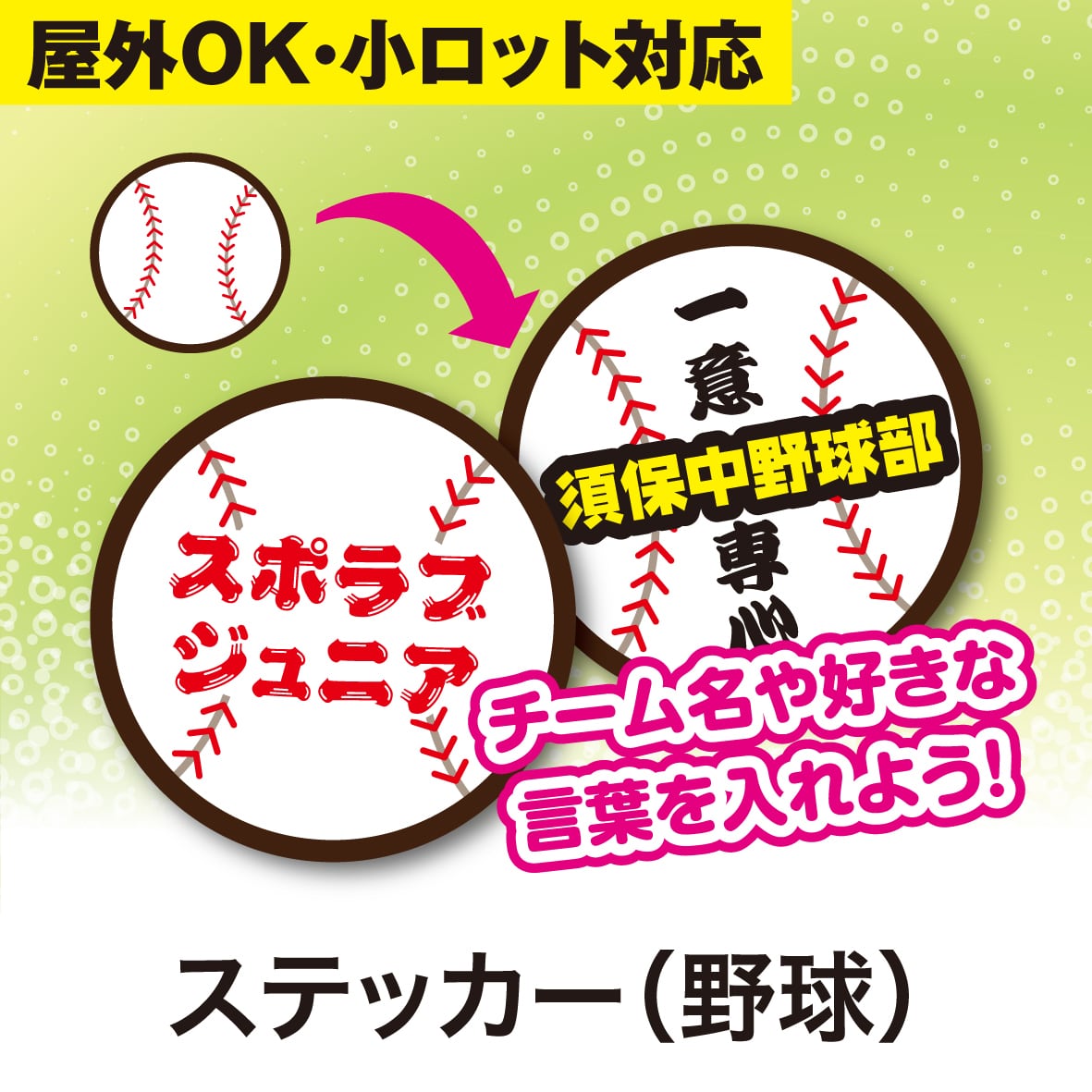 部活・少年野球チームのボール識別や卒団記念、チームグッズ用などに最適。オリジナル感あふれるシールで、チームのまとまりや一体感を演出します。