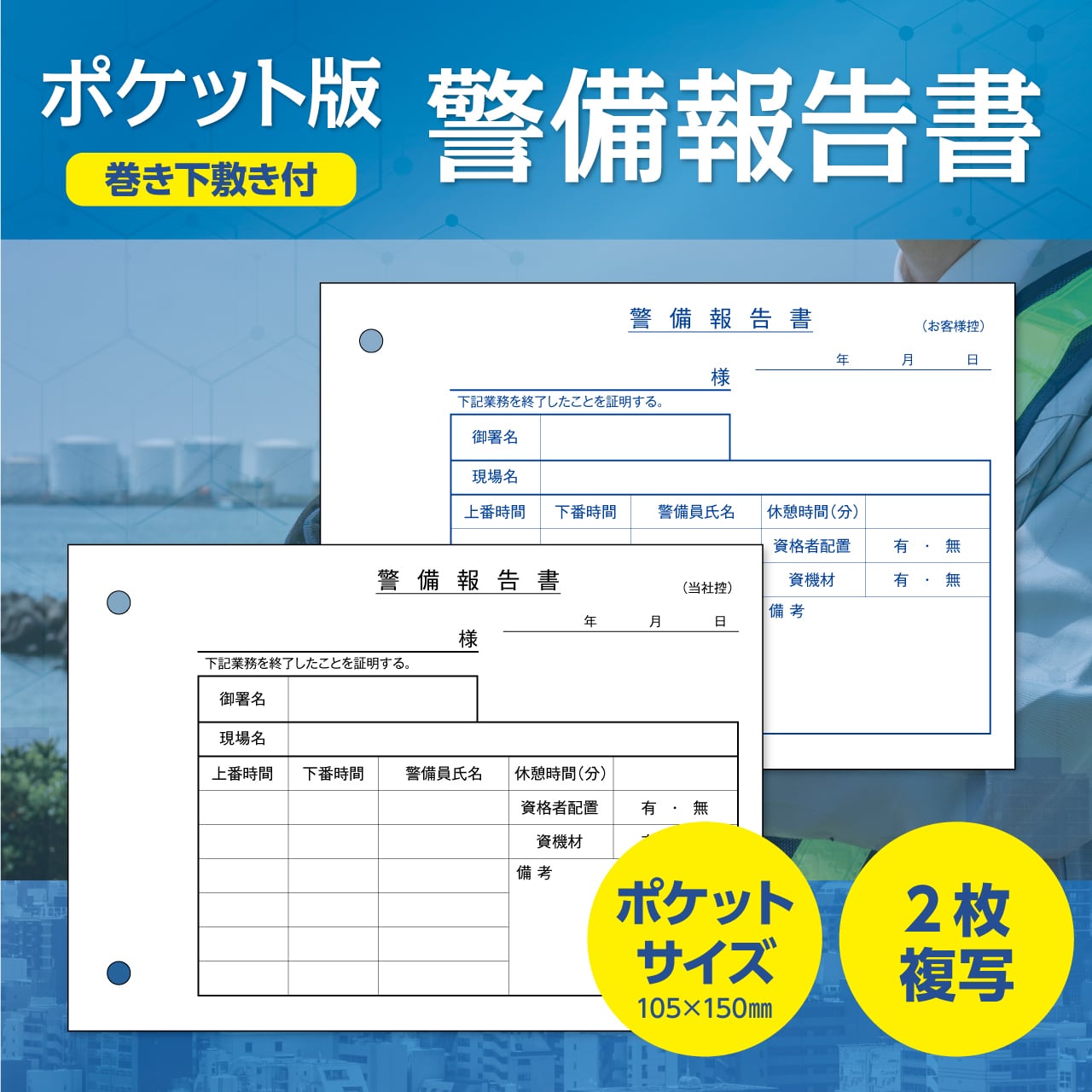 2枚複写タイプのため、1枚目を会社控え、2枚目を提出用としてその場で共有可能。記録の書き写しが不要になり、報告業務の効率化につながります。
